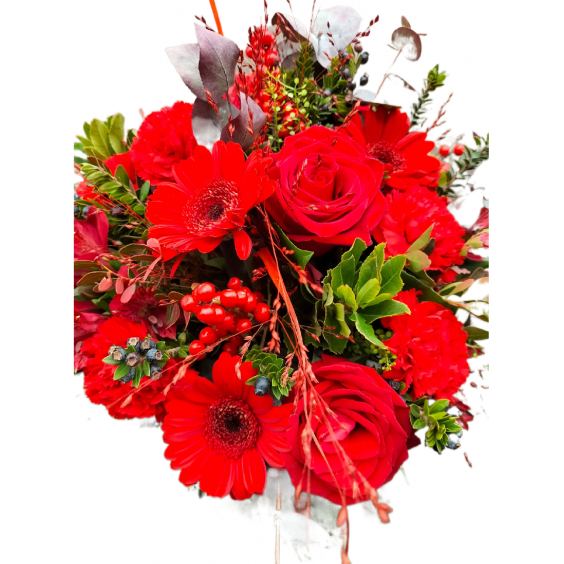 Bouquet rond "joyeux noel" dans les tons rouges. Composé de fleurs coupées et feuillage.