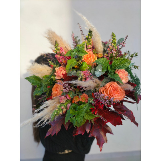 Bouquet longues tiges composé de roses orangées, feuilles de chênes ,mufliers, oeillets, physalis et feuillages divers.